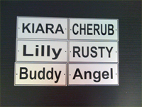 Let your dog live in style and really mark their own territory with their personalised dog kennel name tag. This standout dog kennel name tag is made from double sided aluminium steel ideal for outdoor. Finally your dog can have a place to call their own.